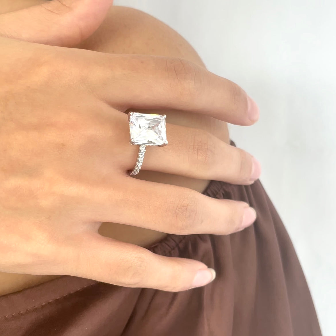 The Honeymoon Ring is a ring made from high quality pure 925 sterling silver and rhodium plating that symbolises the pursuit of happiness and everlasting love. It has an emerald cut cubic zirconia at the heart which, together with the pavé setting and ring band, adds a special sparkle. Our jewellery is durable and suitable for everyday wear and has been designed and made with care and love.