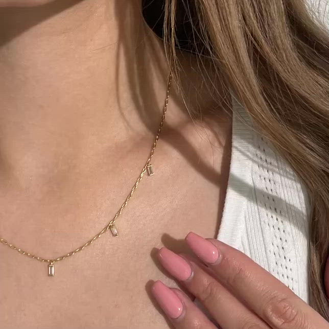 Le collier Verona est un bijou époustouflant, serti de cinq pierres de zirconium isolées et taillées en baguette. Les pierres claires captent la lumière et la font danser, tandis que la surface polie du métal crée un effet brillant. Ce collier est parfait pour briller et s'accorde avec toutes les tenues.